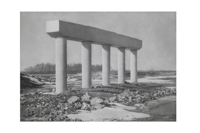 | Exemplary Images Charles Kanwischer at Shaheen Contemporary and Modern Gallery Charles Kanwischer’s soft-focus graphite on panel drawings are like quiet, essentially harmonious visual static, humming around the shapes of remarkable things that everybody sees, but nobody particularly notices. Oversize concrete sewer pipes are lined up like objects in a cubist still life, or a massive piece of road grading equipment is seen, remarkably, to resemble a gigantic fetish object. Each discovery and condition of light emerges ontot he surface of the paper with its own, steady pulse. Flowering weeds and stalks of grass in “Thistle Field” are made up of tiny, sharp marks, catching at the eye like burrs or thorns. Monumental, generic architectural shapes in “US 24 Road Project – Support Columns,” or the calm Big Box-modern décor and furniture in the interior of a model home, based on a photo from a real estate brochure, pull the viewer’s attention into what is, one realizes, a curiously ideal world. Kanwischer’s technique absorbs the gaze like sunblock. First deflecting the impression that his roughly one foot square grisaille studies might be photographs, he goes on to twiddle the knobs of preconception, asking questions about functional hierarchies, observing quirky cultural continuities. He translates ex-urban scenes which, while typical of northeastern Ohio (born in Oklahoma, Kanwischer grew up near Chicago and is currently a resident of Waterville, Ohio), are also typical in a more general sense, as examples of contemporary infrastructure and home construction -- the latest derivations of eternal forms. One of the comforts Kanwischer offers is a sense of recognition: we have all been in these places, passed by these unremarkable scenes, quoted as if randomly from a daily world that might be encountered almost anywhere. Filtered through a fine sieve of observation, his images are winnowed in a way that hints at mysteries, wrapped, and in a way democratized, by a grid of laborious artistic process. Each presents a concise argument for the interest inherent in commonplace sights, especially the sort of low-key, transitional landscape events that occur between suburb and farmland. Familiar drive-by “scenery,” like a low mound of fill dirt, or a mountain of construction debris, or a half-built house patterned from foundation to roof line with the Tyvek company logo, are the subjects here – things that are too ordinary even to be “humble,” and too functional, too lacking in intimate association to register as objects with a significant aesthetic dimension – a dimension that Kanwischer nevertheless manages, unerringly, to locate. Kanwischer’s renderings suggest more pessimistic truths, as well: the constant falling away of form from spirit, and the ruin inherent in all new beginnings. His drawings are like illustrations, fetched somehow from a future time – exemplary images showing a civilizing process of landscape transformation that devolves toward sterile perfection, yet evokes an idyllic classical era. Kanwischer thus invites the past into the present, and not necessarily for purposes of comparison. His “Mound” is a barrow where ancient responses to the land are buried, his “Culvert” an Elysian tarn; nymphs taunt beyond its flaring precast concrete wing walls. These are not romantic visions; it’s not that Eden or innocence can be found by squinting along the length of a pencil, but that the currents of time move through the forms of usage, as inescapable and eternal as weather. -- Douglas Max Utter Charles Kanwischer 6/18/10 – 7/30/10 Shaheen Modern and Contemporary Art 740 West Superior Avenue, Cleveland, OH, Suite 101 216.830.8888 |