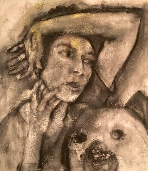 K.R. with Bear (2016) black pastel, latex paint on canvas (available)