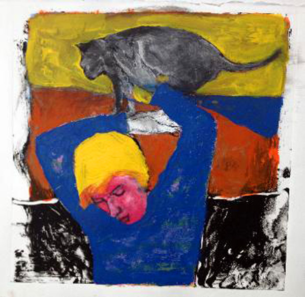 Woman Lifting Cat (2014) acrylic paint, etching ink on Rives BFK, 16"/14" (please inquire for