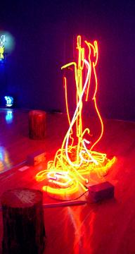 Noble Gas Neon works shine at the Butler Institute In the wake of its economic and political plagues, Youngstown somehow continues to enjoy a degree of cultural health. The Butler Institute of American Art, founded in 1919, has actually prospered under the visionary leadership of Executive Director Louis Zona during the past three decades, renovating older galleries and in 2000 opening the new ultra-modern Beecher Center for Arts and Technology. The Center’s Flad Gallery showcases digital and electronic media, this month exhibiting works by Jeffry Chiplis made out of recycled neon advertisements and decorative strips – “found neon,” as the Cleveland-based artist terms his chosen materials. Neon has been used by a number of mold-breaking modernists, while rustbelt art is often rich in objets trouvés. But taking vintage shards of commercial technology and plugging them into a different end of the culture, playing with a bit of our neglected poetry, is a neat mix of originality and what the periodic table lists as one of the six “noble” gases. Chiplis is a man with an eye for beauty in unlikely places -- he’s known also as a world-class collector of carrot memorabilia, for example. But however you feel about carrots, slinky neon tubing is easy enough to love, with a night time beauty that evokes both the glamour of cities and the glimmering madness of chemistry. Sometimes Chiplis has liberated neon or argon-filled sections of glass tubing from abandoned gas stations or billboards, but he insists that where it comes from doesn’t matter; he plucks it from the rusting city and, after some minor fiddling, plunks it back down, re-contextualized along the byways of his own imagination. At the Flad Gallery his “Egyptian Fantasy” rebuilds the remains of several Camel cigarette advertisements, creating a cartouche-ish tableau: Small blue camels trek in from the right; above them, wavy lines flow and a pyramidal yellow mirage floats near a sun-like coil -- a god ambling past on neon legs. Or there’s “Bonfire,” where flame-like red and yellow shapes rise from a fiery tangle of phosphorous-coated glass, surrounded by real logs arranged as makeshift stools. The tone of Chiplis’s re-contextualizations blinks between canny neo- Dadaist punning and more contemporary, deep-pile abstraction. Several years ago noted art critic and scholar Thomas McEvilley became aware of Chiplis’s sculpture/installation work and penned a center spread for an issue of Art in America. Shows in prestigious New York venues ensued, but the artist, while pleased, remains undistracted by his fame. New works like “A Dull Swim,” so-called because of slight damage to the final “t” in a found-neon phrase, further juxtaposed with a man’s face, a hand, a zero, and a plus sign -- are as crisply ambiguous as ever. Chiplis continues to place image-laden materials at a new angle to the eye, reinventing their corner of space and time. Through May 9, 2010 Jeffry Chiplis / Neon Works in the 21st Century The Butler Institute of American Art 524 Wick Ave. Youngstown, OH |
