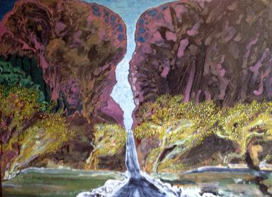 between them, looking also like a waterfall rushing down. The trees part, like some